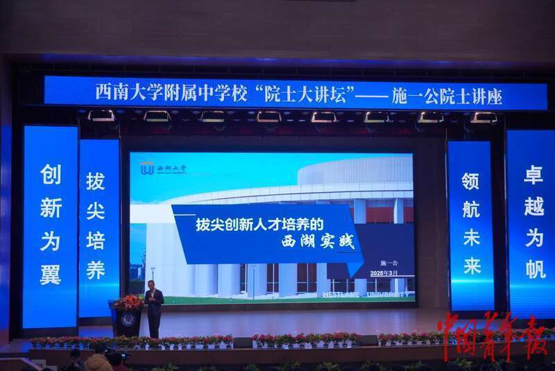 中国青年报客户端讯(余婷 中青报·中青网记者 耿学清)3月1日下午,中国科学院院士、西湖大学校长施一公在西南大学附属中学(以下简称“西南大学附中”)带来《拔尖创新人才培养的西湖实践》主题讲座,并与在场师生就基础教育阶段的创新人才培养路径进行了交流。